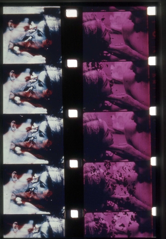 Carolee Schneemann, hai dải phim từ Hợp Nhất, 1964–67, phim 16 mm được chuyển sang video HD, màu, im lặng, 29:51 phút, phim gốc bị đốt cháy bằng lửa và axit, được sơn và cắt dán.