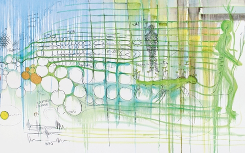 Quay trở lại với bức tranh trên, nhân vật mà họa sĩ thể hiện là đại diện cho những người đến và áp đặt cái riêng của họ lên thế giới bằng cách phá vỡ nó, nghĩ rằng họ có thể kiểm soát nó bằng công nghệ kỹ thuật số, được thể hiện bằng các đường đan chéo nhau ở phía ngoài cùng bên phải của bức tranh. Nhưng ngay cả khi hệ thống vô tri và có hệ thống này tồn tại, sự sống thực vẫn có thể vượt qua. Điều đó được lý giải ngay trong tác phẩm khi cơ thể của nhân vật hợp nhất với sự sống thực vật. Sự liên kết này được họa sĩ đã lấy cảm hứng từ gạch lát sàn và phòng tắm nơi thường xuyên bị nấm mốc do độ ẩm.
