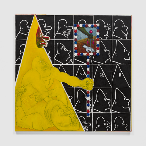Trenton Doyle Hancock, Let's Try the Yellow Triangle Angle or The Return of Piss Christ, 2022. Được phép của nghệ sĩ và Shulamit Nazarian, Los Angeles. Ảnh: Ed Mumford.