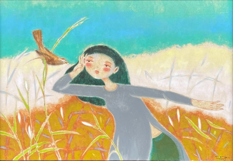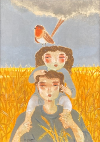 Bố em và chim - My Dad and the Bird, 2023, 60x80 cm, Acrylic trên giấy dó bồi toan - Acrylic on padded Do paper