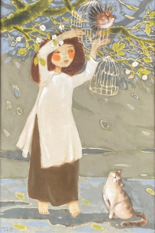 Phóng sinh - Repatriation, 2023, 70x100 cm, Acrylic trên giấy dó bồi toan - Acrylic on padded Do paper