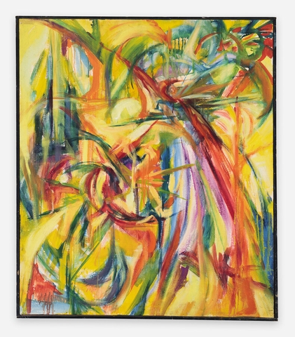 Carolee Schneemann, tác phẩm Pin Wheel, 1957, sơn dầu trên toan, gắn trên bánh xe của thợ gốm quay bằng thép, 30 3/4 x 36 x 1 3/4 inch.