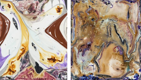 Hai tác phẩm nghệ thuật của Manuel Mathieu, Được sự chấp thuận của hoạ sĩ và phòng trưng bày Pilar Corrias, London. Trái: Khởi nguồn của Tự nhiên 2, 2022. Phải: JJ, 2022.