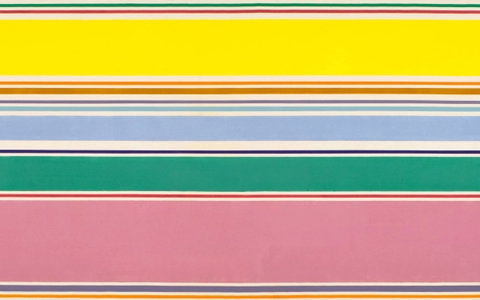 Một nhân vật quan trọng trong phong trào Trường màu, Kenneth Noland đã sử dụng các bố cục đơn giản và hình dạng phẳng để khám phá mối quan hệ hài hòa giữa sắc màu. Những tác phẩm của ông sử dụng các thành phần vật liệu cơ bản của chúng là bột màu được áp dụng cho toan canvas trải dài trên giá đỡ. Bởi vì Noland coi các góc cạnh của bức tranh cũng quan trọng như phần trung tâm, nên ông thường đề cập rõ ràng đến tính chất giãn ra của chúng. Dài gần 13 feet, Dải tầng màu sắc (1967) là một tập hợp tối thiểu các dải phẳng màu vàng chanh, hồng bụi, kem và xanh lá cây trải thẳng trên canvas. Được sắp xếp một cách có trật tự – mỗi sắc độ được phân bổ không gian thích hợp để tỏa sáng – các màu sắc dường như ngân nga trong một bản hợp xướng; có lẽ là nhạc nền khi nhìn thấy phong cảnh mùa hè thoáng qua từ cửa sổ của một chiếc ô tô lướt nhanh qua.