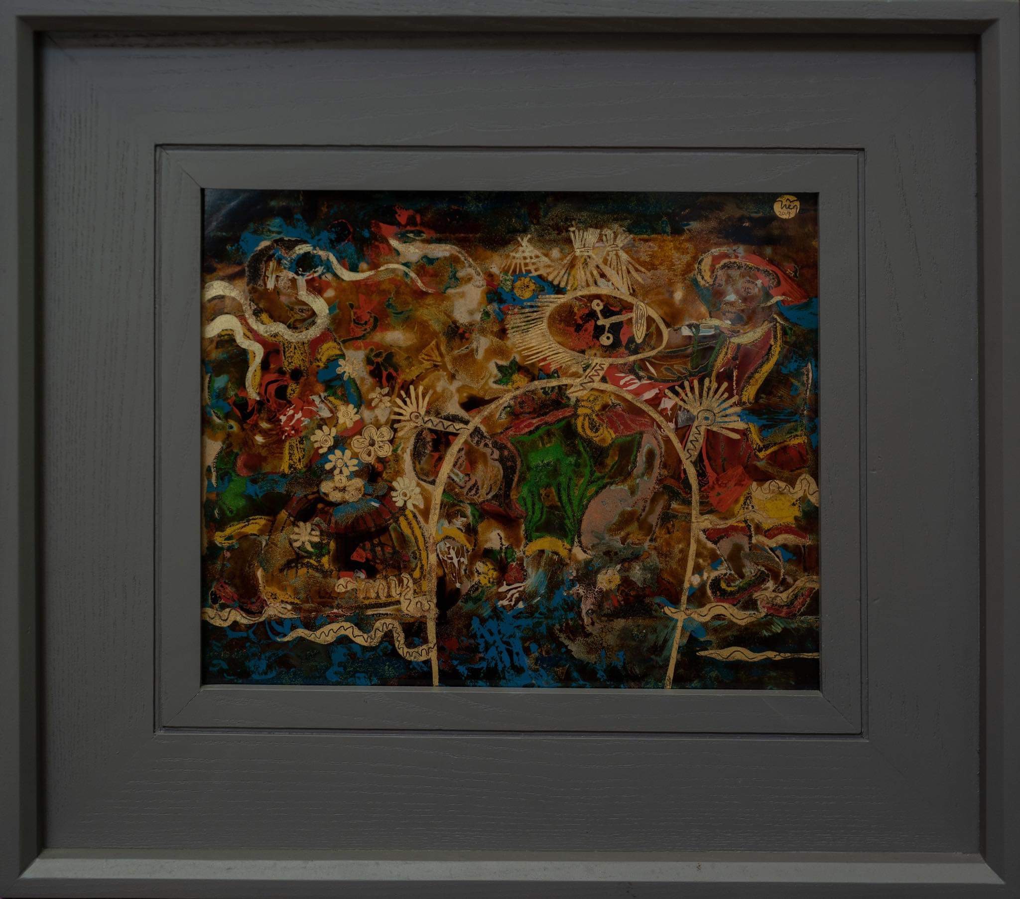 Cultural inspiration is one of the themes that viewers often encounter in Trieu Khac Tien’s lacquer paintings. We continue to see the artist’s attempt to blend folk aesthetics with modern imagery. In the painting "Spontaneous Dong Ho", the artist depicted three little boys in traditional costumes surrounding a birdcage, while the protruding peach blossom branches signal the beginning of spring, similar to the Dong Ho folk painting: "Playing with birds". Moreover, it requires some effort to fully see the shape of the figures in Dong Ho folk painting, this is due to the various details such as flowers, dragons, groves, etc., enveloped upon each other. Comprising mostly lacquer, the painting can preserve past images with its array of faded coatings, overlapped by modern and decisive brushstrokes. True to its name, the spontaneity in the painting allures viewers to explore.