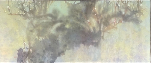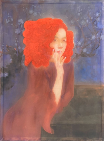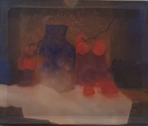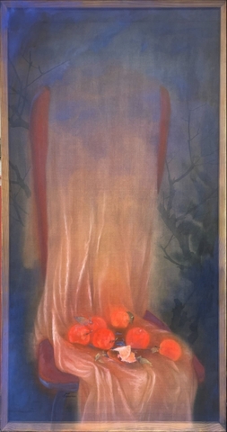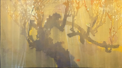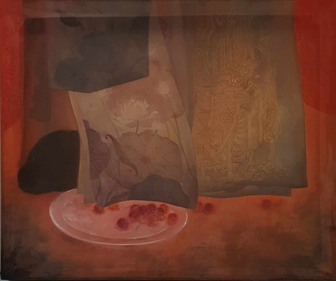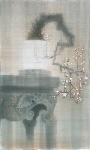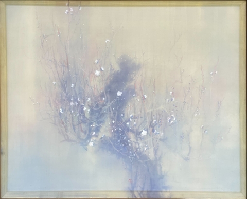 Đây là bộ tĩnh vật mà họa sỹ vẽ theo lối nhuộm lụa sâu, tạo ra không gian ẩm ướt, cảm giác mơ màng của mùa xuân.