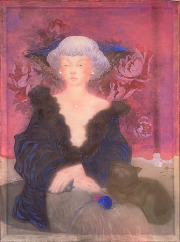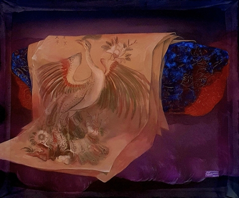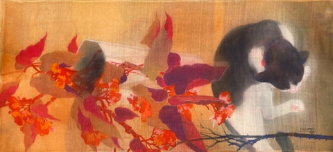 In this painting, Nguyễn Văn Trinh combines the deep-dyeing silk painting technique and embossed painting style to achieve a simultaneous effect of dreamy tenderness and a vigorous expression through the lingering color particles on the material.