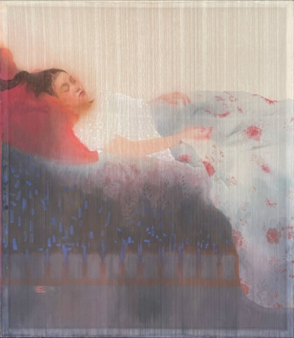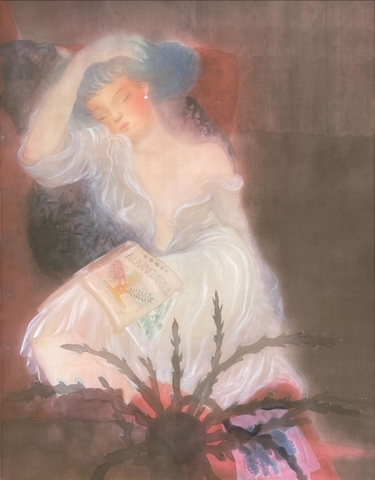 The painting "Sweet Dreams" is a personal story about a young singer close to artist Nguyễn Văn Trinh. Amidst her increasingly hectic life, the image of her sleeping peacefully became the inspiration for the art piece.