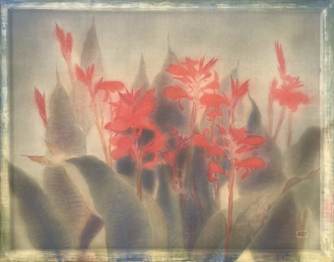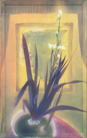 The artist shares that the flowers depicted in the painting used to bloom abundantly in front of his house; unfortunately, he can’t recall their name. Behind the flower vase is a blurred painting. "I’m quite keen on this painting but sometimes I have to put it behind, in a blurred corner per se, to search for something new for myself." - Nguyễn Văn Trinh.