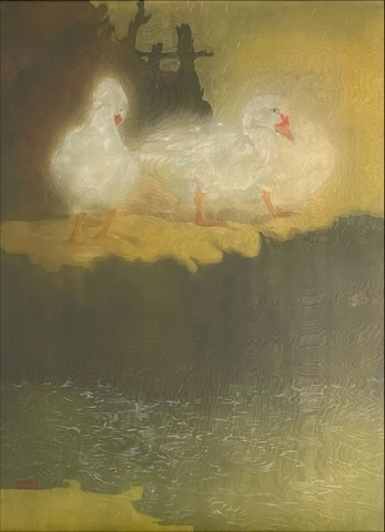 Nguyễn Văn Trinh vẽ một góc bờ ao có mấy chú vịt gặp mưa, đậm vẻ thôn quê và nhiều cảm xúc. Khi trời mưa, bầu trời âm u, ngược lại con vịt trông sáng trong, bông lên trong làn hơi ẩm.