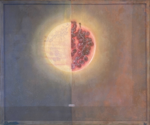 The painting is composed of a circle divided into two halves, one side vibrant while the other opaque, symbolizing the transition between the past and the future. The interstice embodies reality. 'I want to have a positive outlook on all matters while painting this piece,' Nguyễn Văn Trinh states.