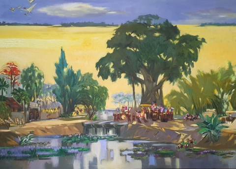 Bức tranh "Chiều vàng" của họa sĩ Lưu Quang Lâm được vẽ bằng chất liệu sơn dầu trên toan, về một buổi chiều trên làng quê quan họ. Bức tranh diễn tả cảnh một đám rước quan họ trên triền đê đang hướng về cổng đình. Đám rước nhỏ bé trong khung cảnh rộng lớn của làng quê cây đa, mái đình là một đề tài không mới nhưng được thể hiện với ấn tượng và bút pháp riêng của họa sĩ.
