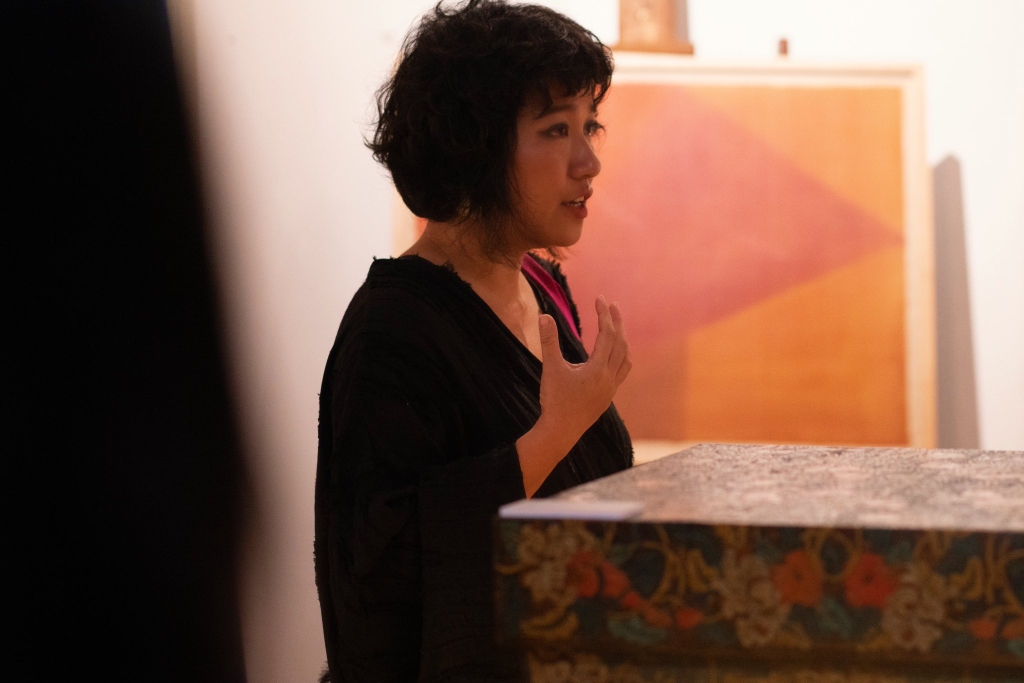Giám tuyển bộ sưu tập Vân Vi chia sẻ trong buổi khai mạc "Trong dòng chảy của lụa 2025"